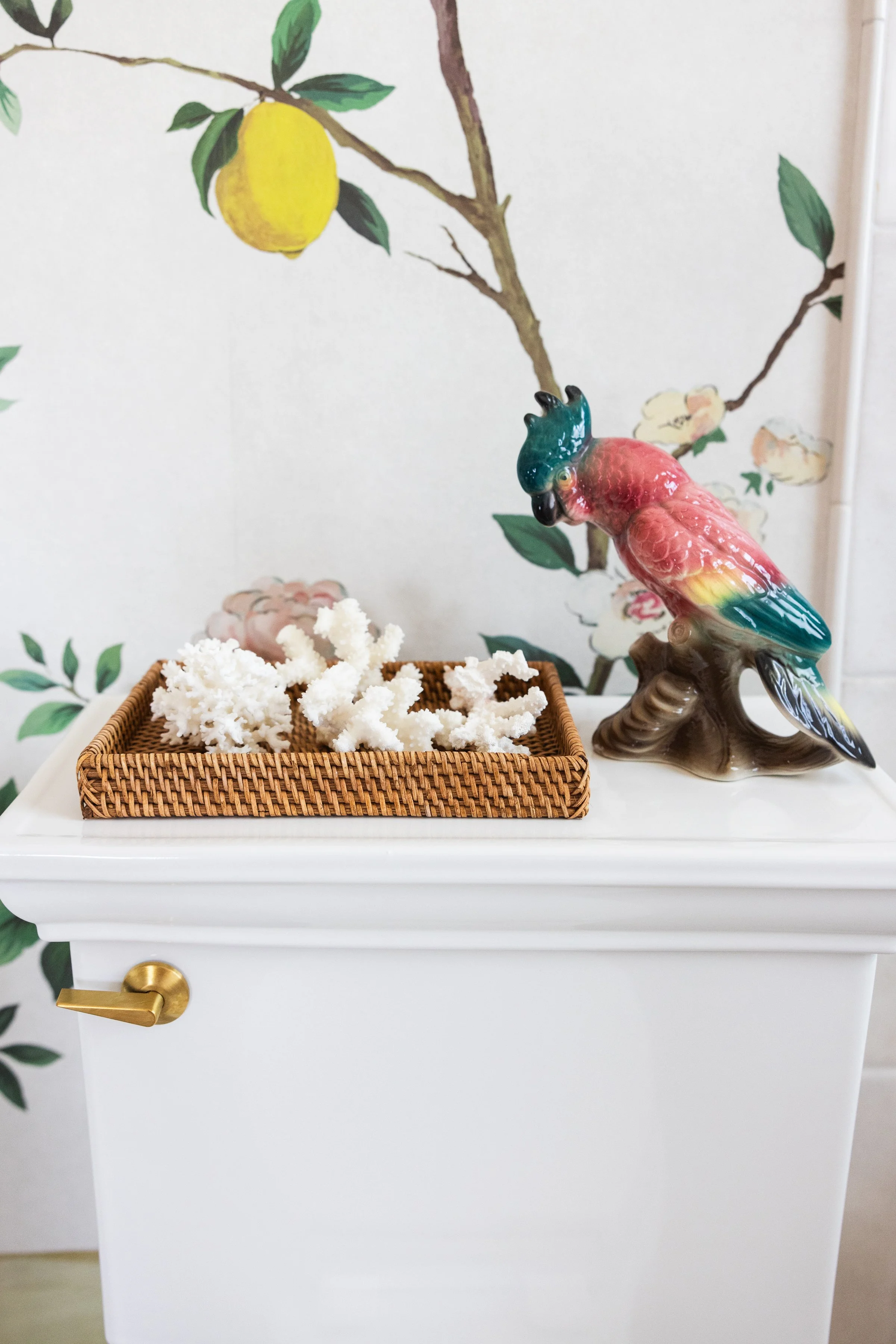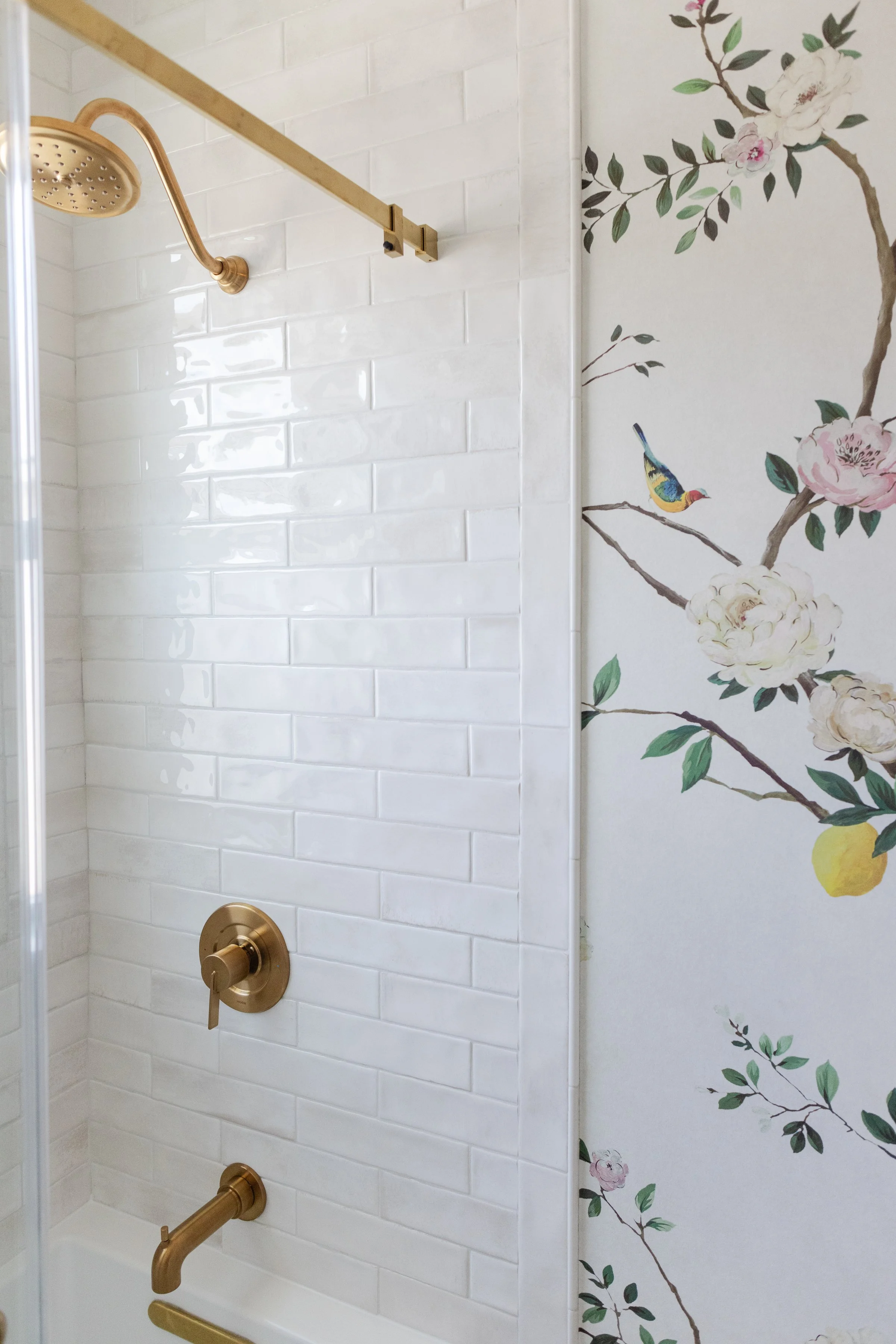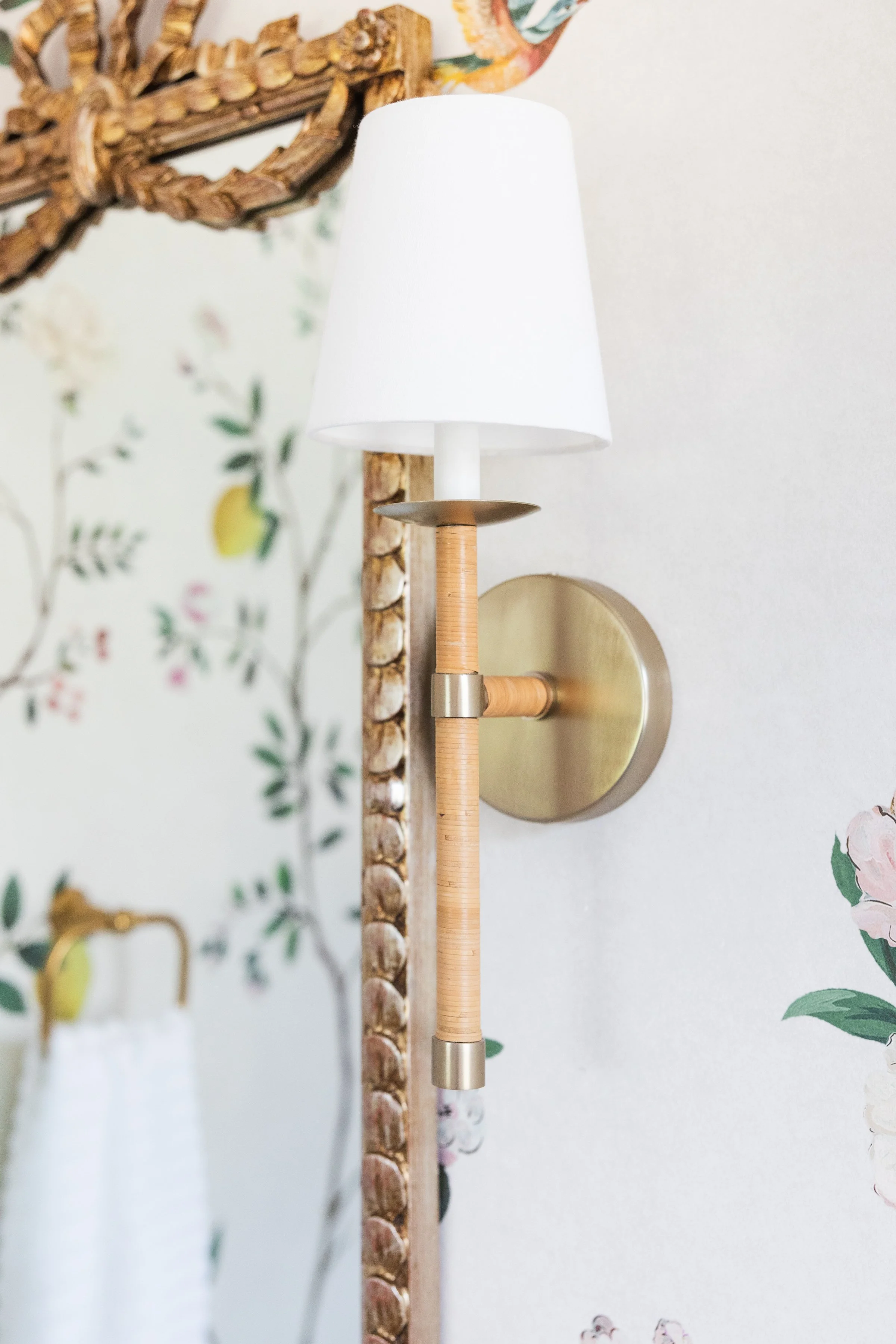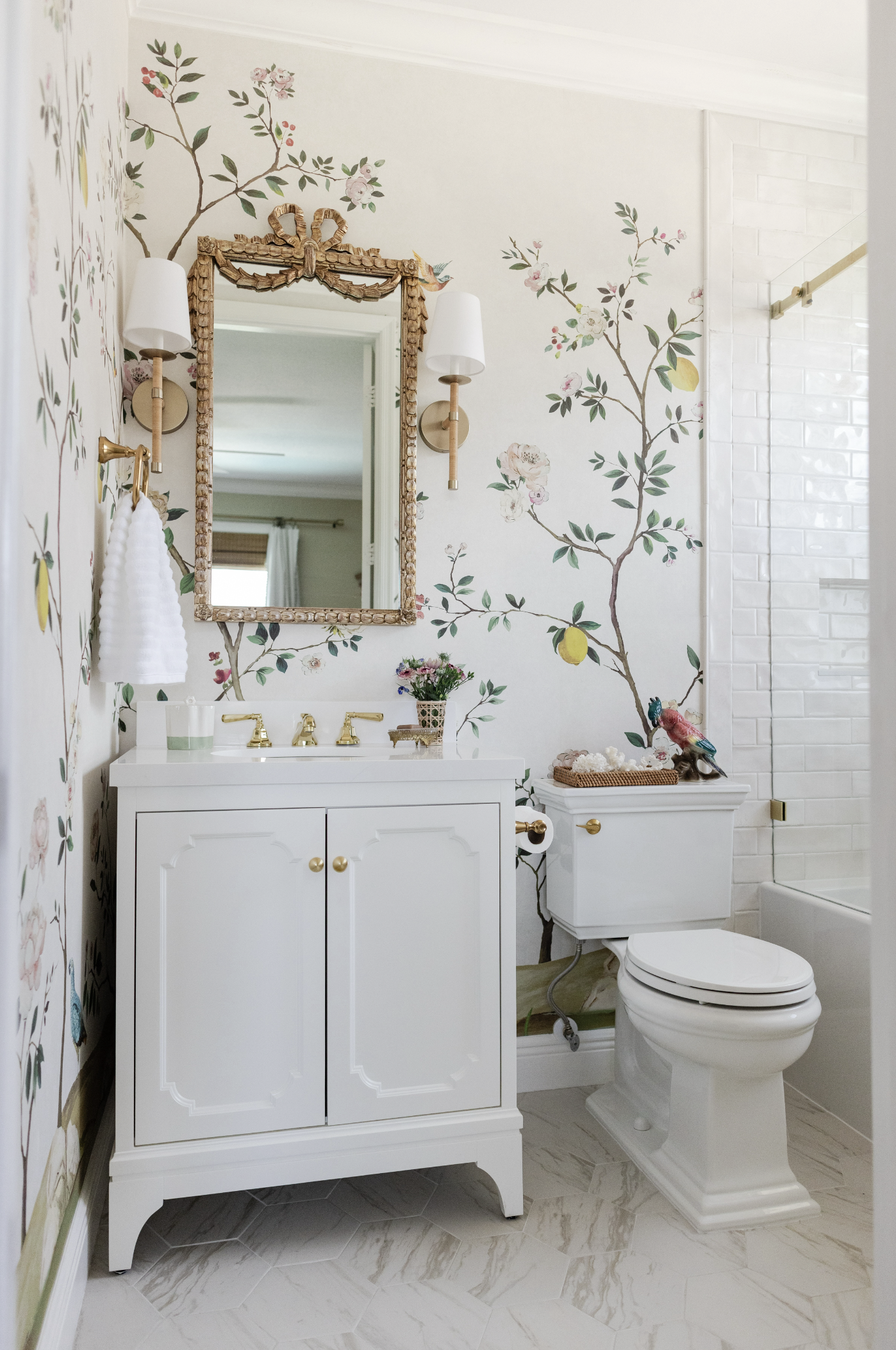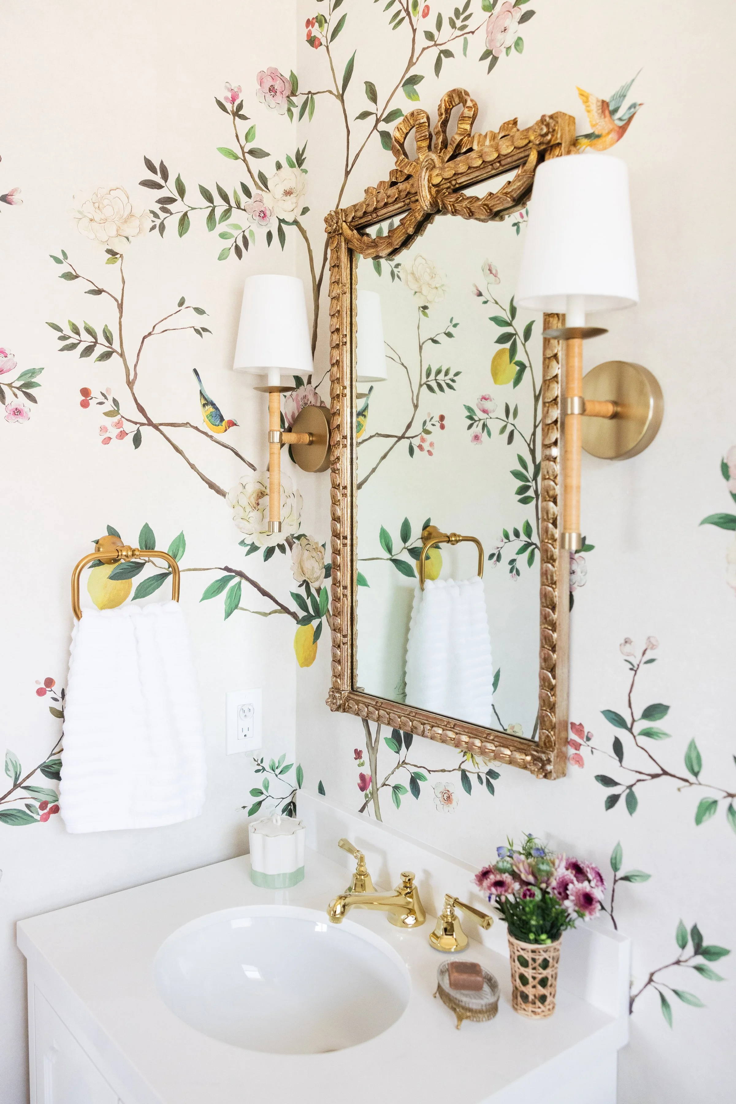 Designed to grow from girlhood into adolescence, this bathroom balances feminine softness with intentional timelessness. A paneled chinoiserie mural wallpaper brings soft color and pattern to the walls, while a gilded mirror discovered by the client adds a sense of character and history. Rattan-wrapped lighting introduces a subtle Palm Beach influence, completing a space that feels girly, refined, and made to mature alongside its occupant.