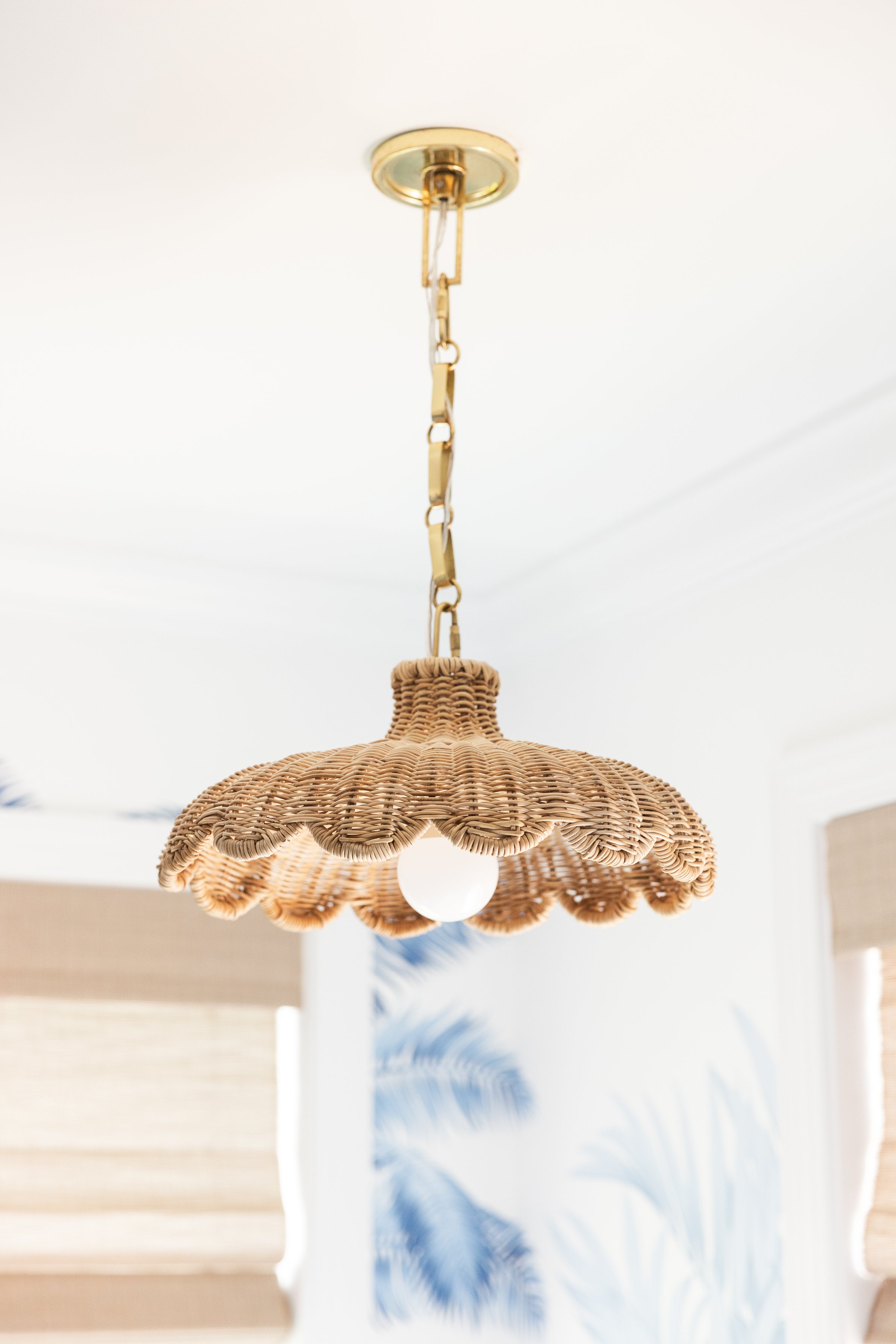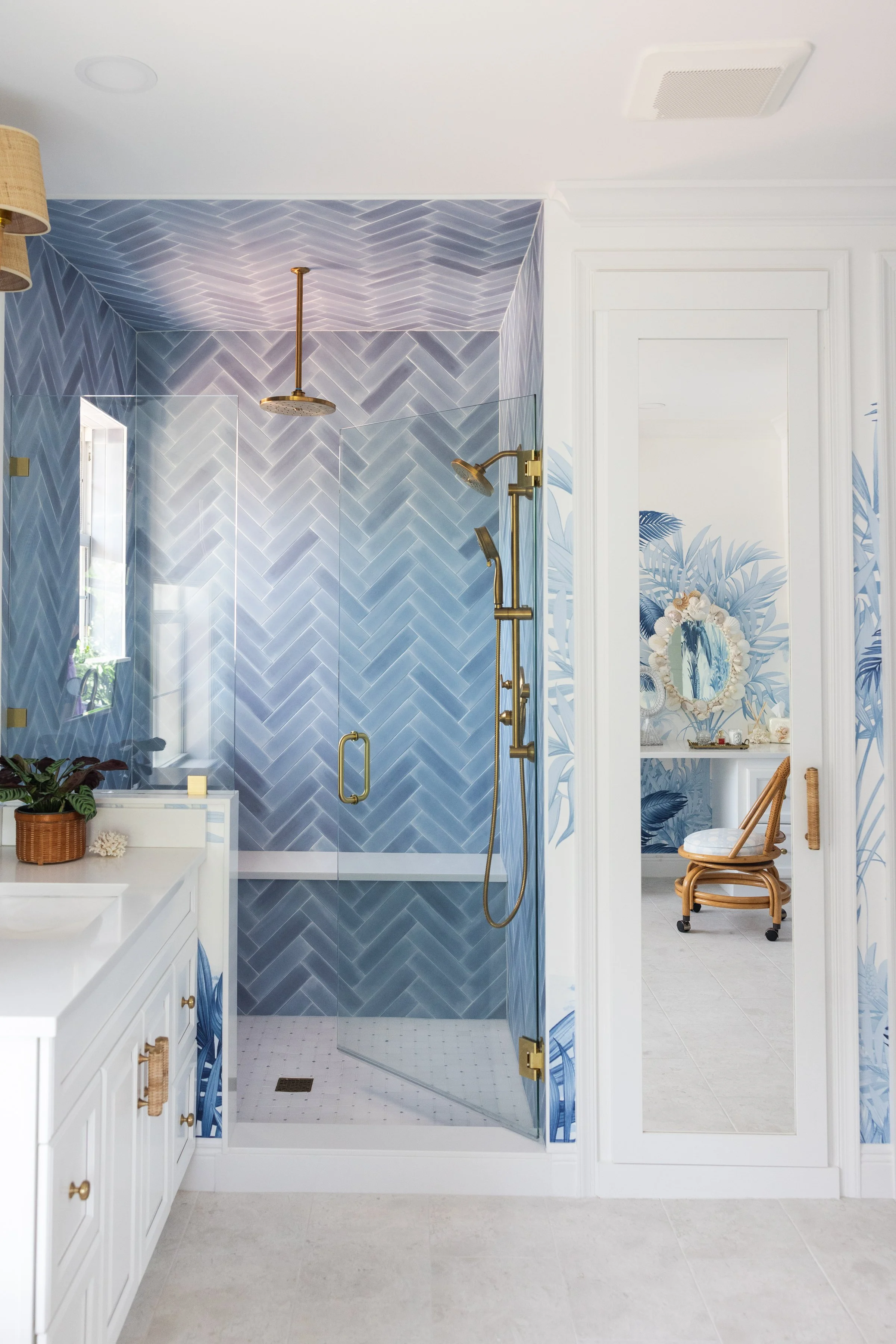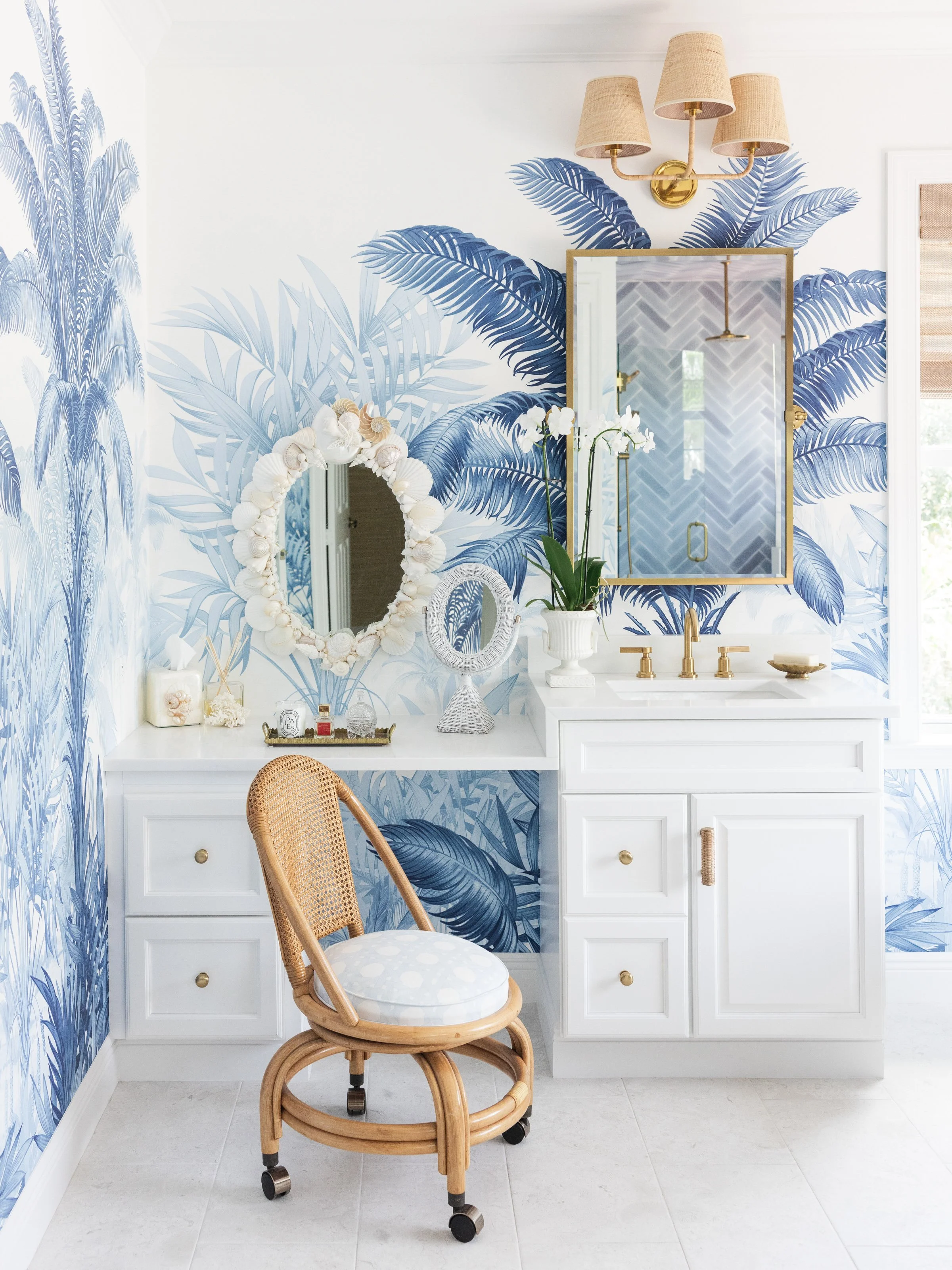 Imagined as a private oasis, this bathroom draws inspiration from the feeling of stepping into a Palm Beach hotel suite. A blue and white palm mural sets the scene, while tile wrapping the walls and ceiling creates a fully enveloped space. A semi-custom vanity with a shell mirror anchors a dedicated makeup area, while raffia lighting and a scalloped rattan pendant introduce a playful contrast to the room’s more polished finishes.