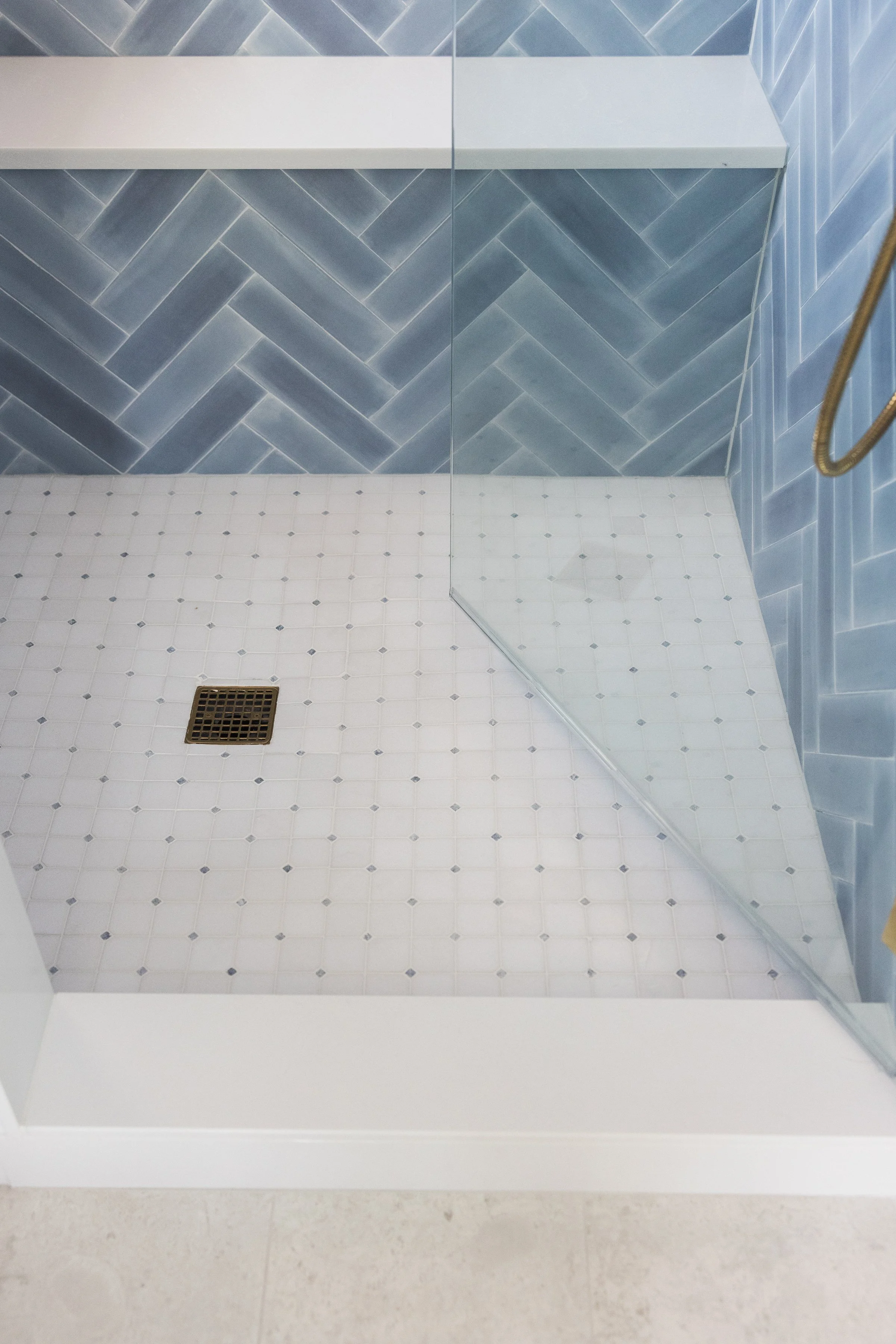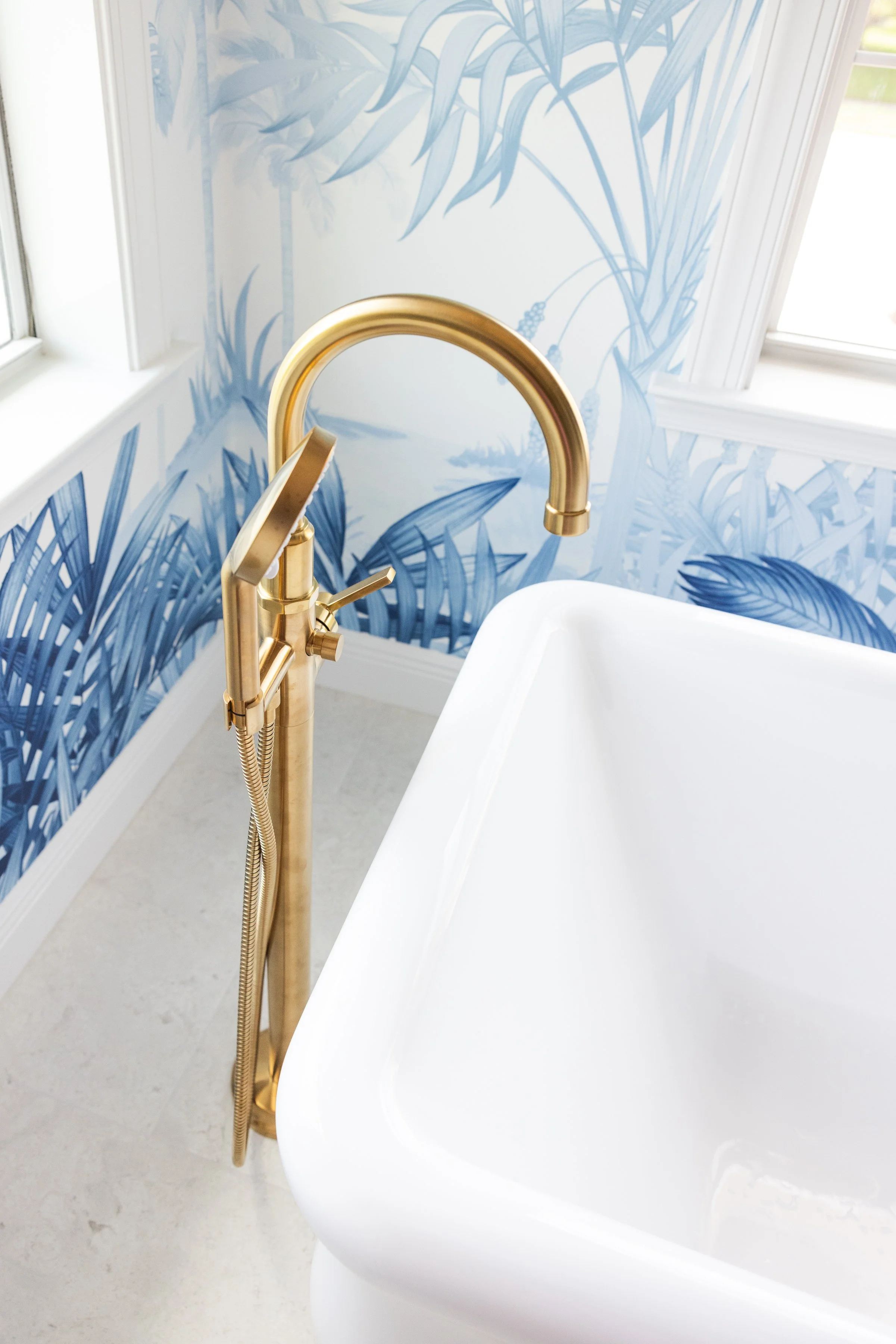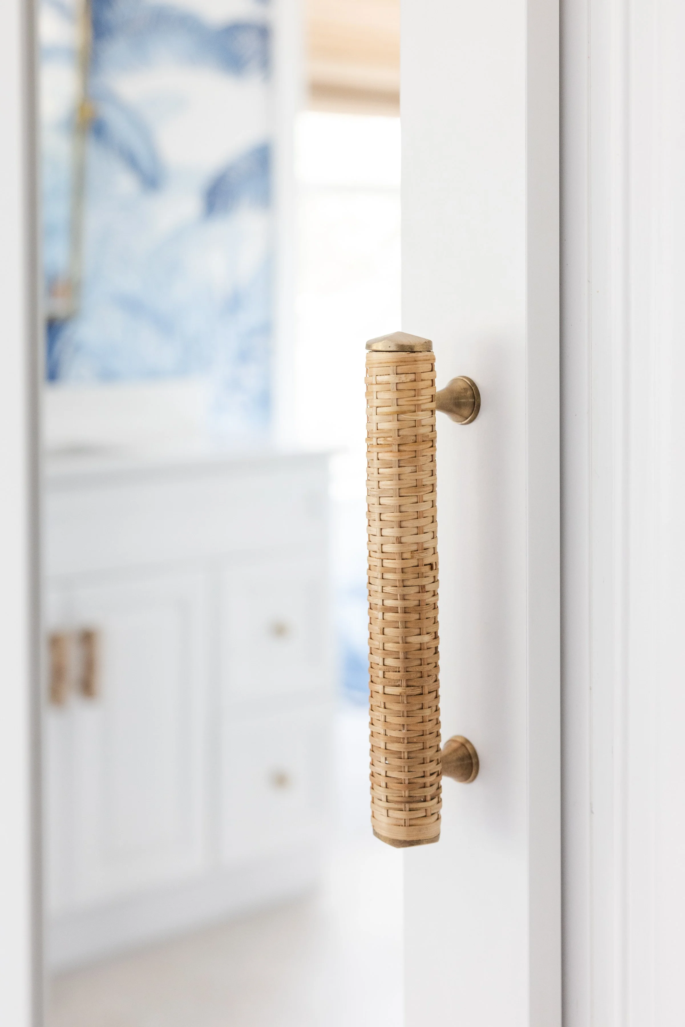 Imagined as a private oasis, this bathroom draws inspiration from the feeling of stepping into a Palm Beach hotel suite. A blue and white palm mural sets the scene, while tile wrapping the walls and ceiling creates a fully enveloped space. A semi-custom vanity with a shell mirror anchors a dedicated makeup area, while raffia lighting and a scalloped rattan pendant introduce a playful contrast to the room’s more polished finishes.
