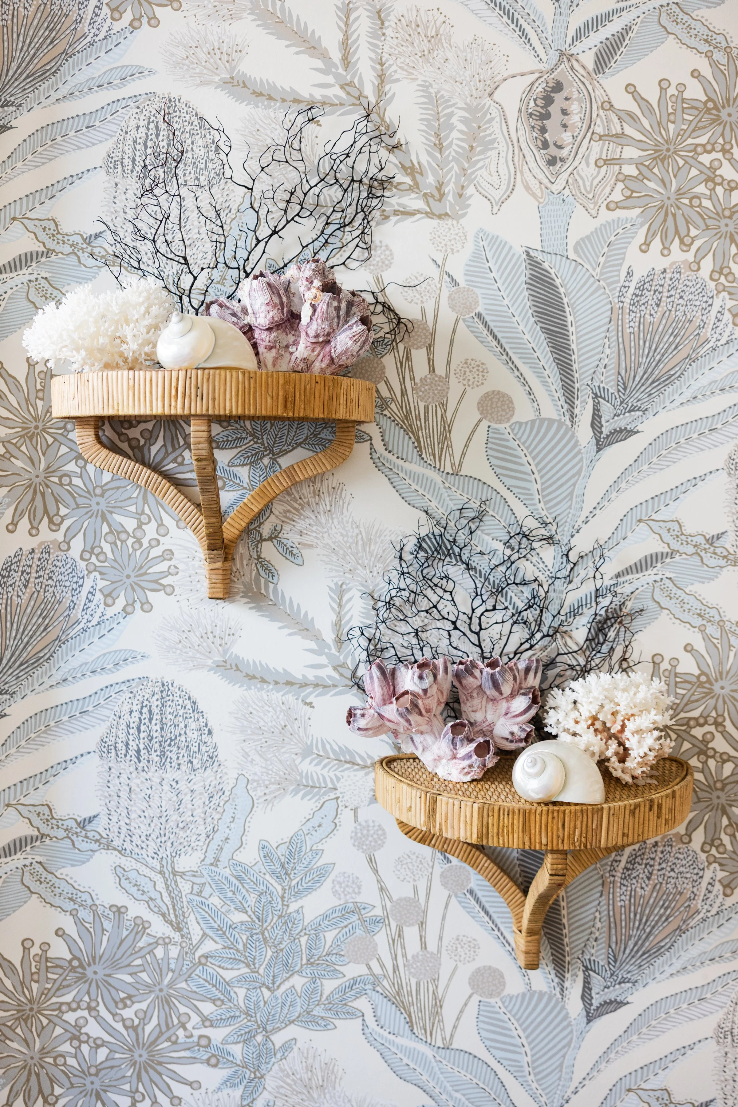 Old Florida Bungalow Chinoiserie Girl’s Bath Guest Bath Grotto Palm Suite Bath Blue Grasscloth Boy’s Bathroom