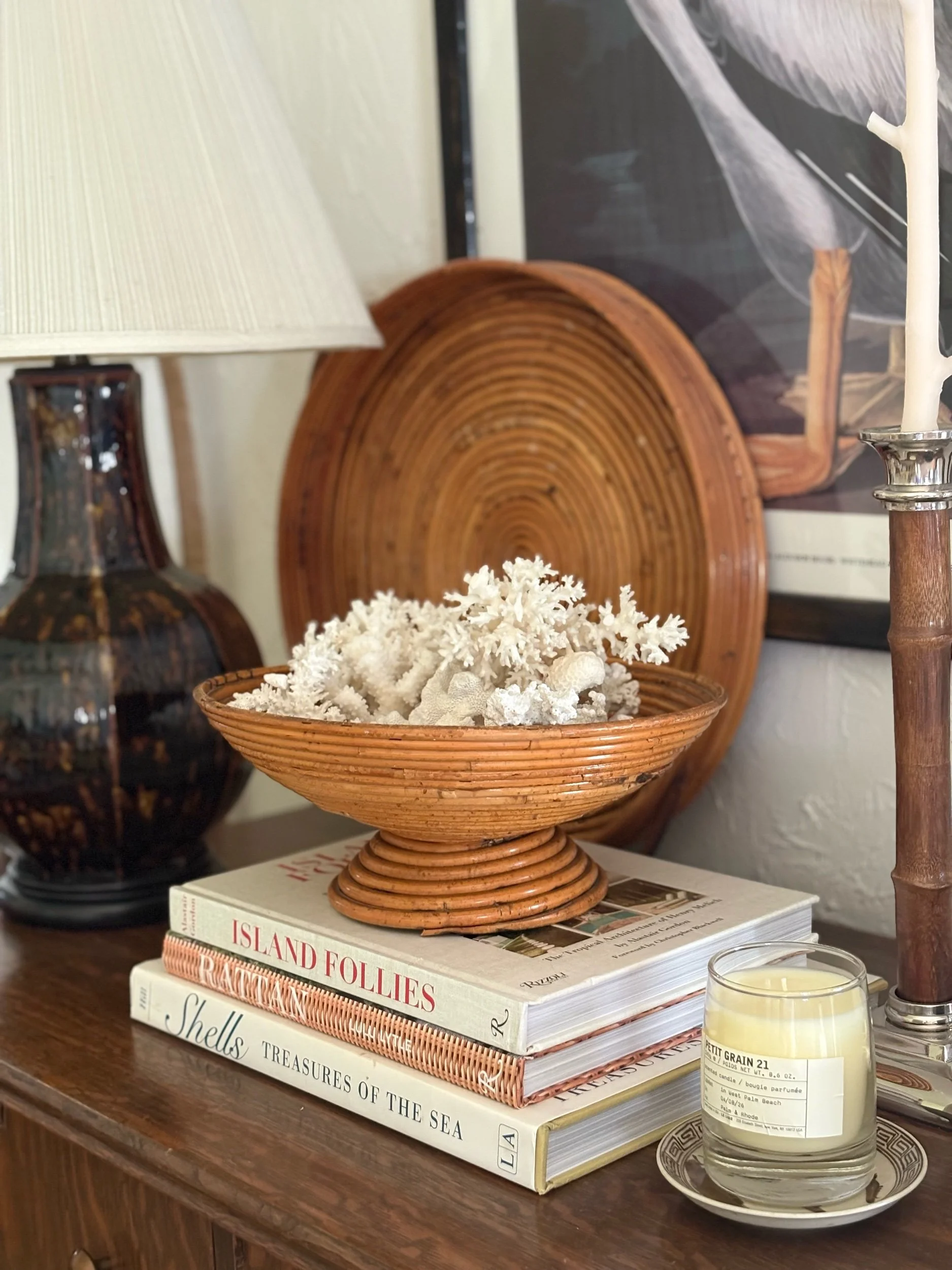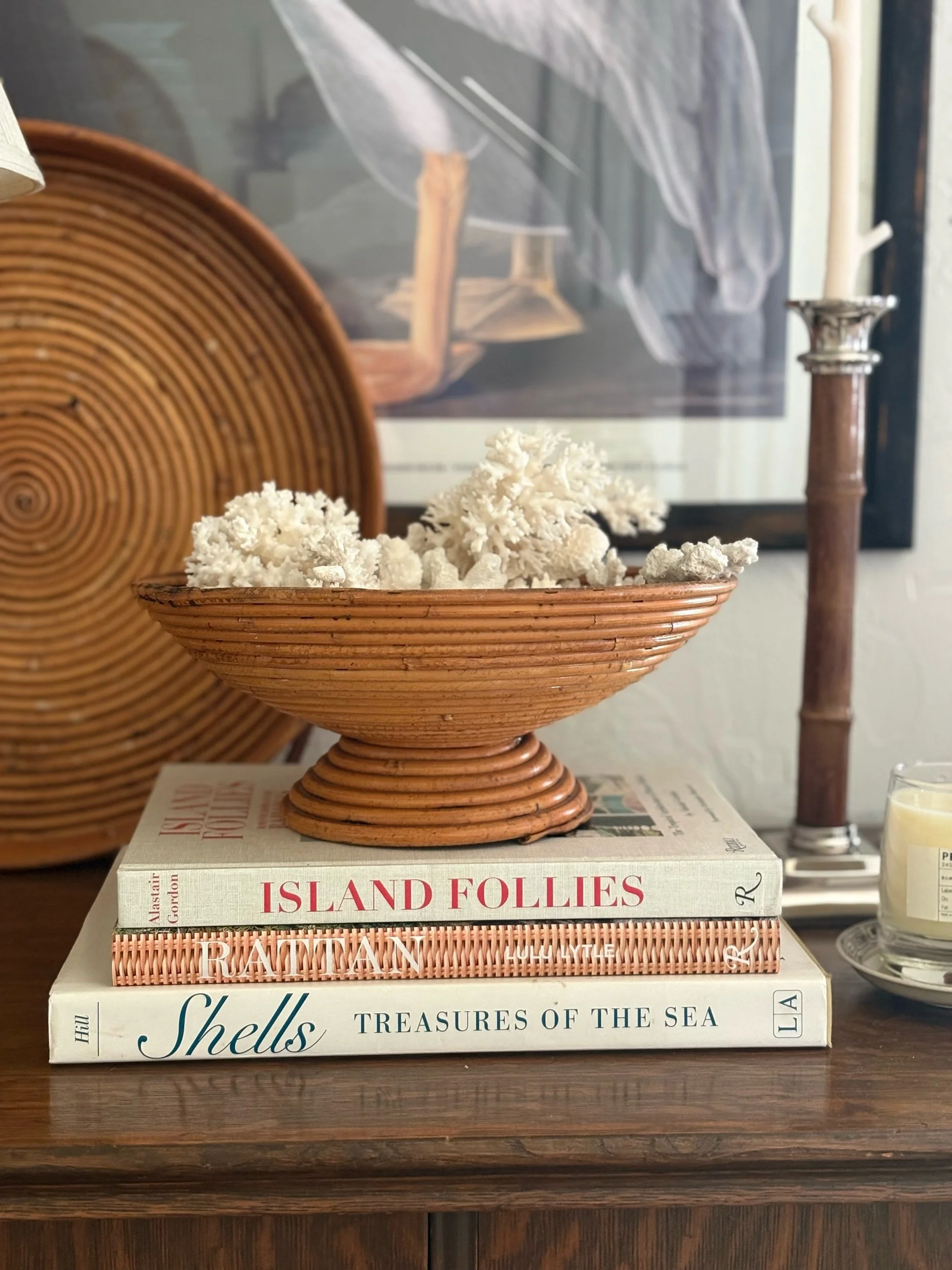 A charming vintage pencil reed pedestal bowl in the style of Gabriella Crespi, with warm honey tones and beautifully sculptural form. The elevated silhouette makes it a lovely accent for a console, bookshelf, or cocktail table..