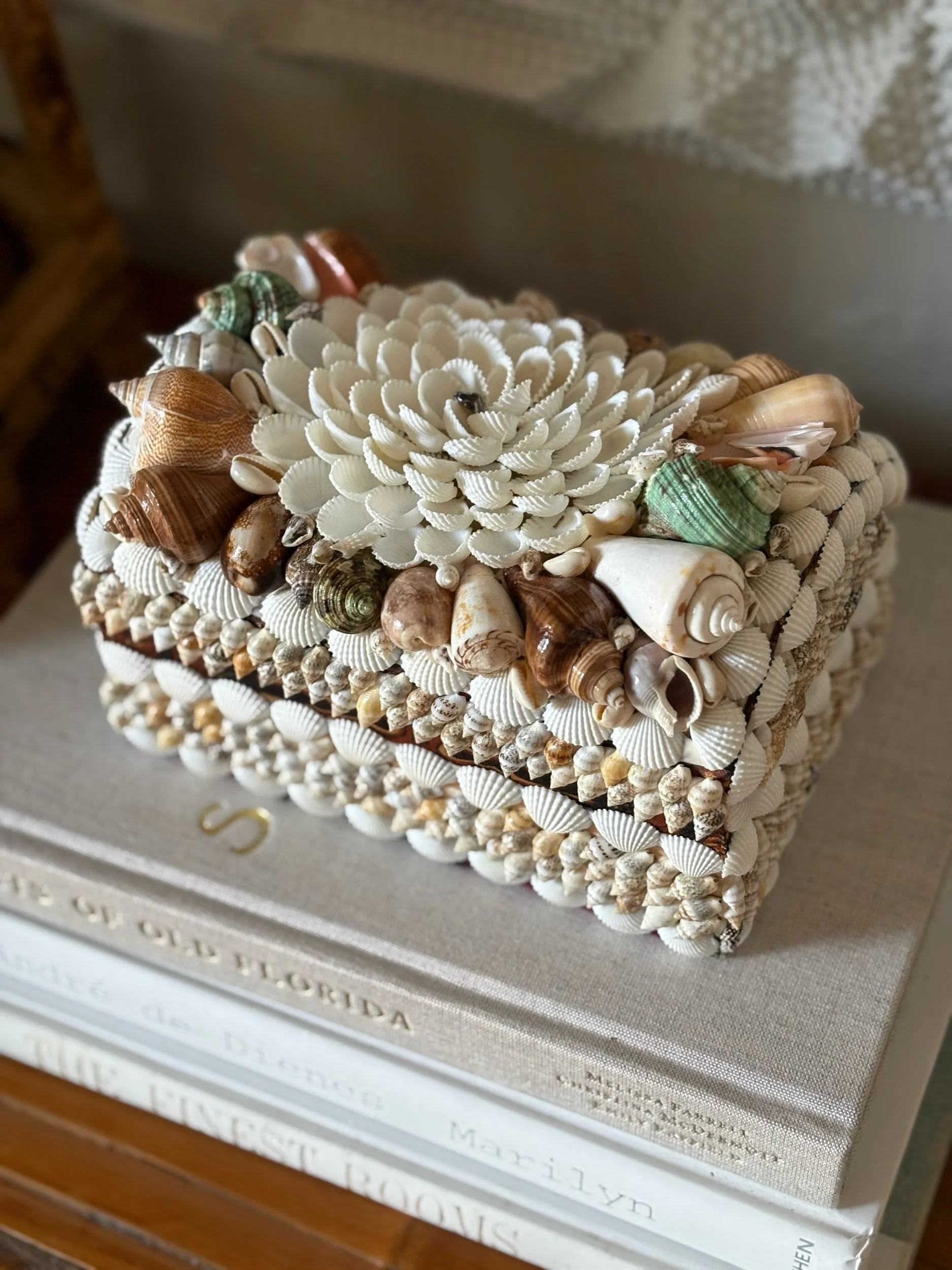 A wonderfully over-the-top vintage shell-encrusted trinket box with dimensional shellwork throughout and a dramatic floral shell motif across the lid.